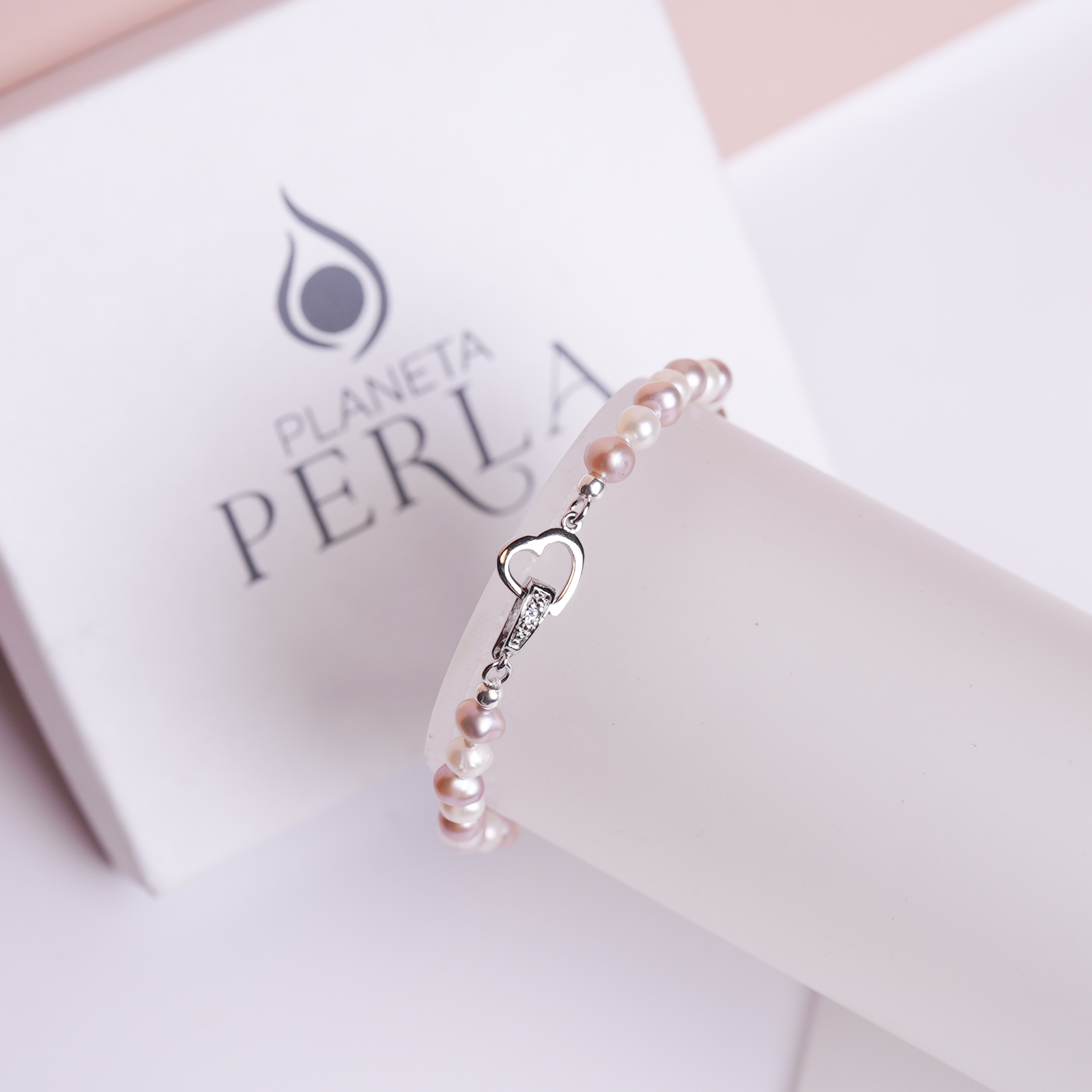 LINDA PULSERA DE PERLA CULTIVADA EN COLOR BLANCA Y LAVANDER CON DIJE DE CORAZON, ES PARA MUÑECA GRANDE
